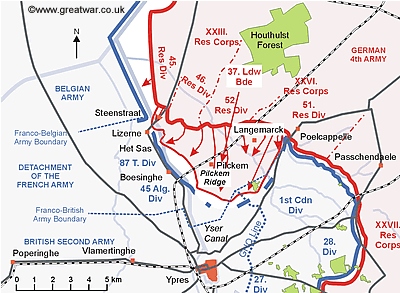 37. Landwehr Brigade, recently brought into the battle zone from the reserve, was ordered to consolidate a reserve position on the Pilckem Ridge. The commander of the heavy artillery was ordered to move his batteries forward and form them up, so as to be able to fire on enemy positions west of the Yser Canal and on the town of Ypres.