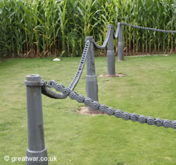 An interesting feature of the memorial is the boundary “fence” around the obelisk. In the application to build the memorial the fence was suggested as a way of keeping cattle away from the plinth of the memorial. The boundary fence consists of ten upright 6 pounder tank gun barrels with tank driving chains mounted across them.
